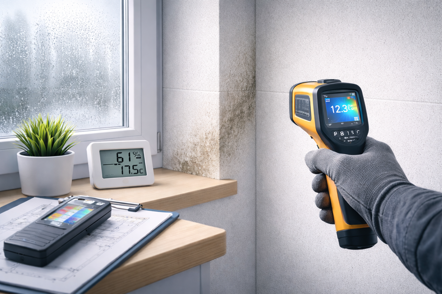 Wir prüfen vor Ort Oberflächentemperaturen, Luftfeuchtigkeit und mögliche Wärmebrücken.